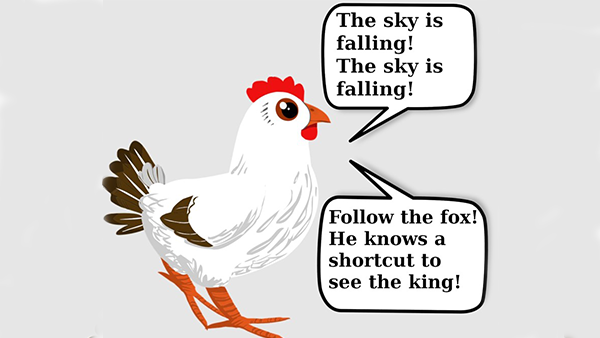 Perhaps you remember the story of Chicken Little, the hen who got excited when an acorn fell on her head. She began running around hollering, “The sky is FALLING! The sky is FALLING!” On the way to tell the King about this catastrophe, she met her friends – a rooster, a duck, a goose and a turkey – who then became seized by fear, achieving a kind of mass animal hysteria. By the time they all met the fox, their judgment was essentially consumed by the mania, and they fell for the fox’s deception about a shortcut to see the King. So they followed the fox right into his den where they became dinner for the Fox family.