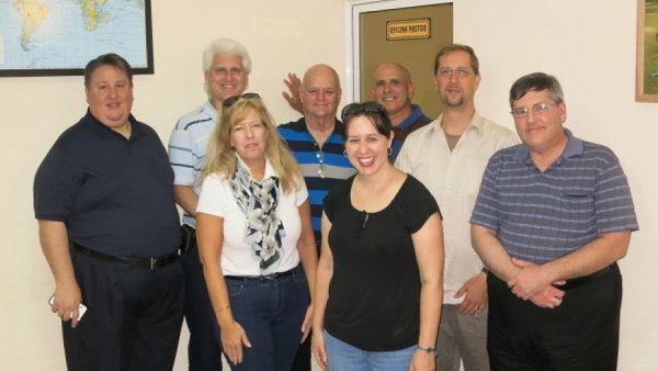 (Photo of TWR's John Summerville (back row, 2nd from left) and the Baptist pastor from Camaguey (back row, 4th from left, in front of door))